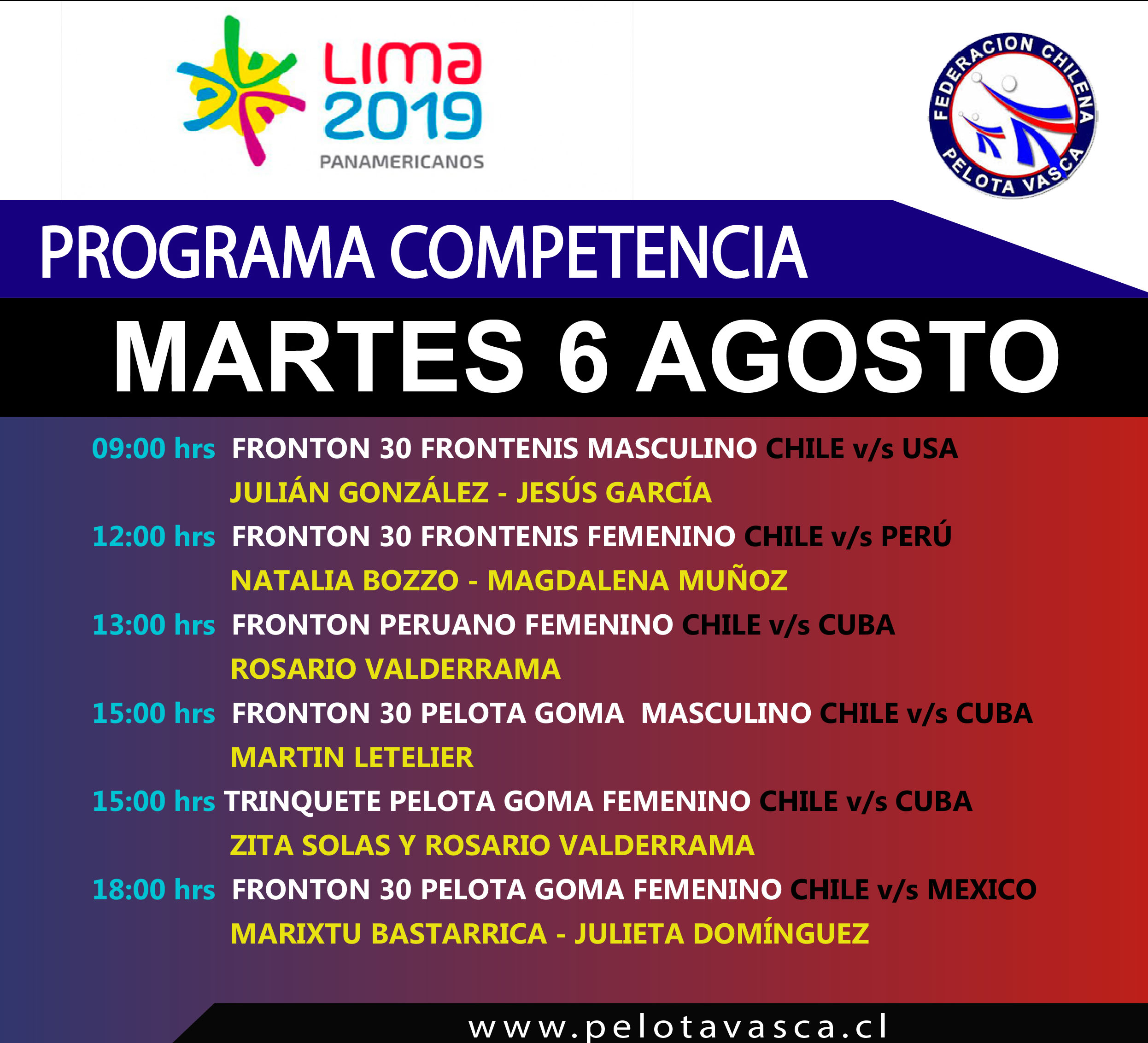 05 Ago PANAMERICANOS LIMA 2019 PROGRAMA COMPETENCIA MARTES 6 Categoría: Noticias Última actualización: Lunes, 05 Agosto 2019 22:13 Publicado: Lunes, 05 Agosto 2019 20:17 Visto: 845 Imprimir Correo electrónico 05 Ago