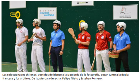 Los jugadores nacionales Felipe Nieto y Esteban Romero, junto al técnico David Vara, ya están en Biarritz para representar al país en la competencia de paleta cuero juvenil. Los pelotaris chilenos deberán enfrentar a los seleccionados de Francia, Cuba y México, quienes componen el resto del Grupo A Clasificatorio.