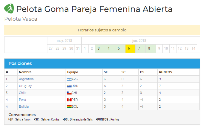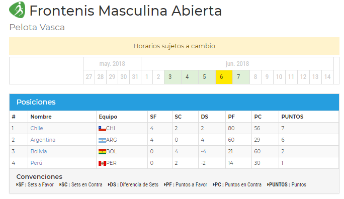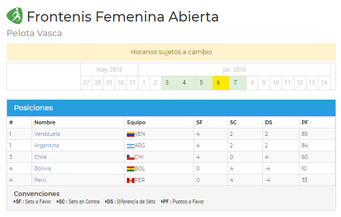 Nuestros pelotaris, siguen afianzados en su juego, mostrando el profesionalismo y trabajo logrado por varios meses de entrenamiento. Así lo refleja la siguente tabla de posiciones.