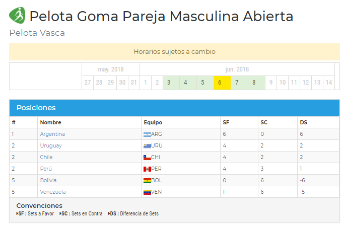 Ayer, la selección chilena de Pelota Vasca, derrotó a su par peruano por 2 – 0 en la modalidad Frontenis – Masculina. Durante la tarde, se enfrentó a los seleccionados de Venezuela, venciendo por 2 – 0 en Pelota Goma Pareja – Masculina.