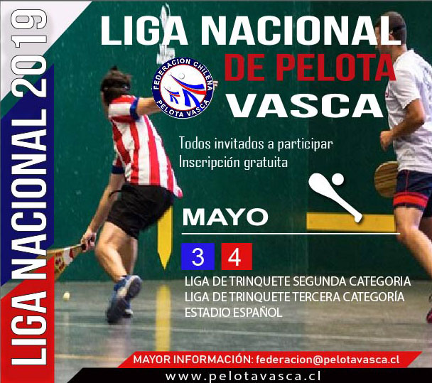 30 Abr Liga Nacional Pelota Vasca Categoría: Noticias Última actualización: Martes, 07 Mayo 2019 11:56 Publicado: Martes, 30 Abril 2019 17:37 Visto: 971 Imprimir Correo electrónico 30 Abr Este viernes 3 de mayo desde las 18: 00 hrs. y este sábado 4 de mayo desde las 10: 00 hrs. se realizará en el Estadio Español la Liga Nacional de Pelota Vasca de Trinquete Segunda Categoría y Tercera Categoría. liga nacional