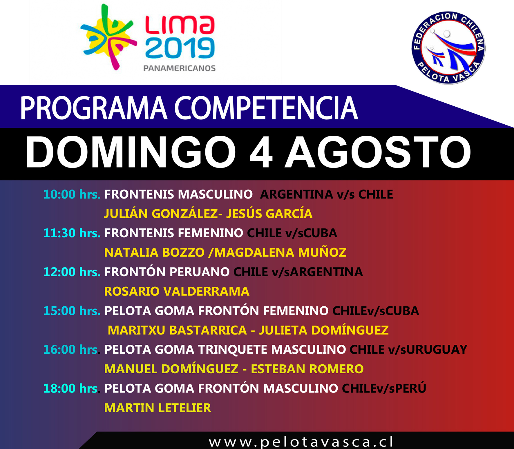 04 Ago PANAMERICANOS LIMA 2019 PROGRAMA COMPETENCIA DOMINGO 4 AGOSTO Categoría: Noticias Última actualización: Domingo, 04 Agosto 2019 21:26 Publicado: Domingo, 04 Agosto 2019 12:32 Visto: 765 Imprimir Correo electrónico 04 Ago